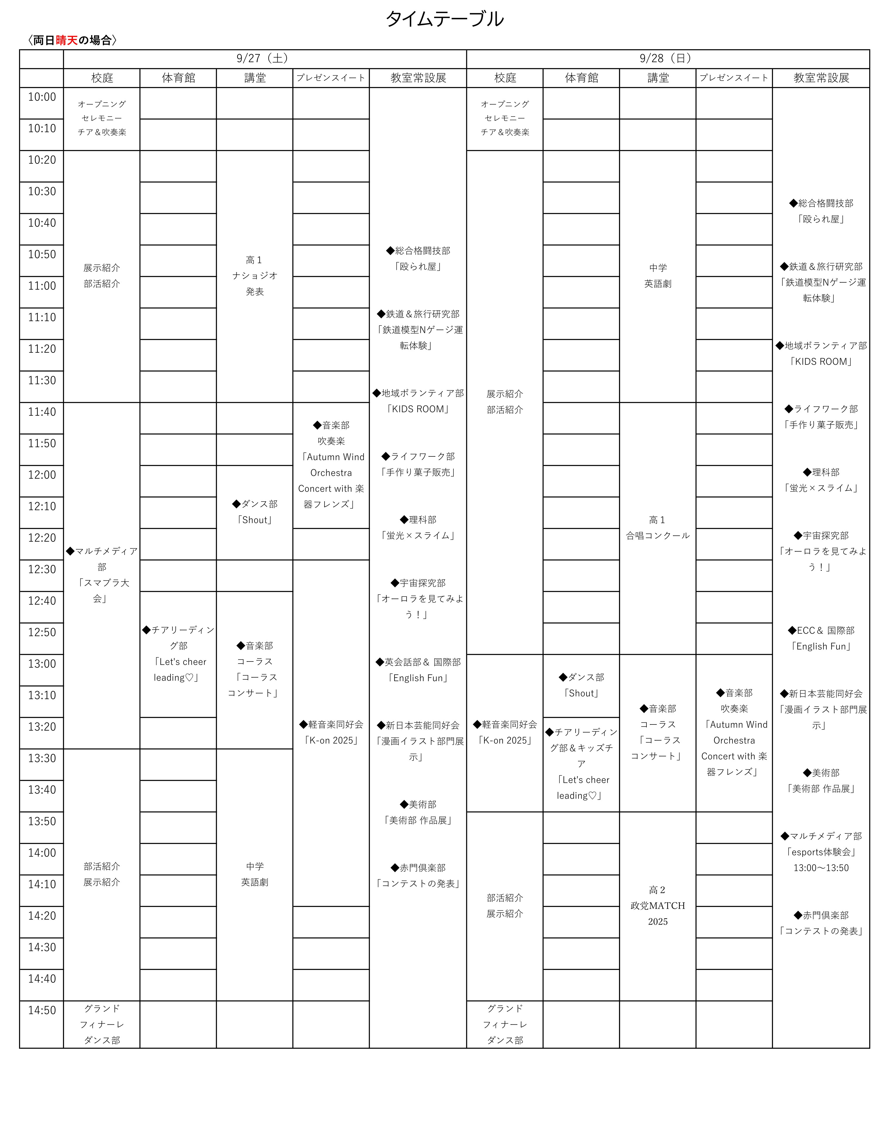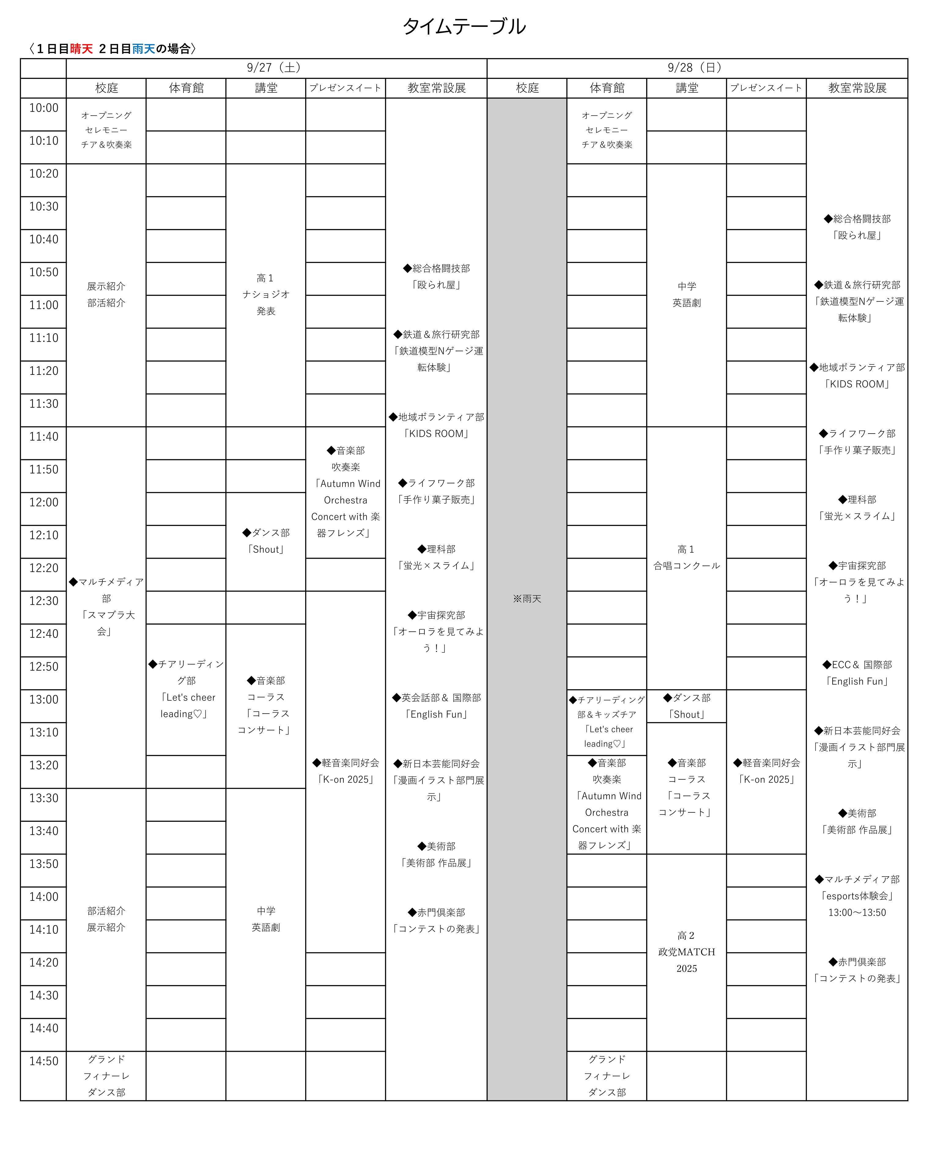 なお、1日目の天候によっては、2日目が晴れていても雨天用スケジュールでの実施となる場合があります。