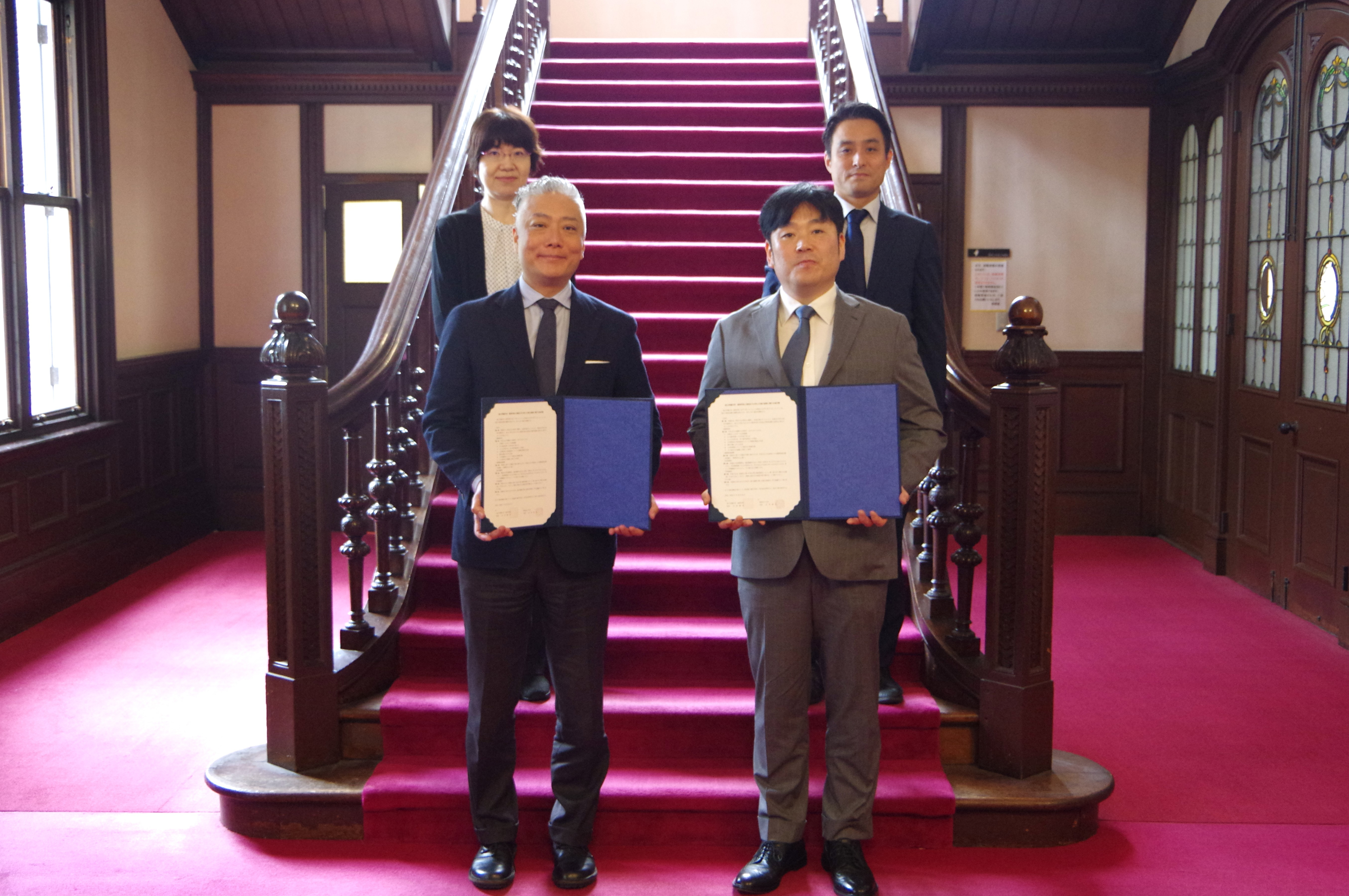 協定書を取り交わした山本達也学長(左)と元呑健司校長(右) |