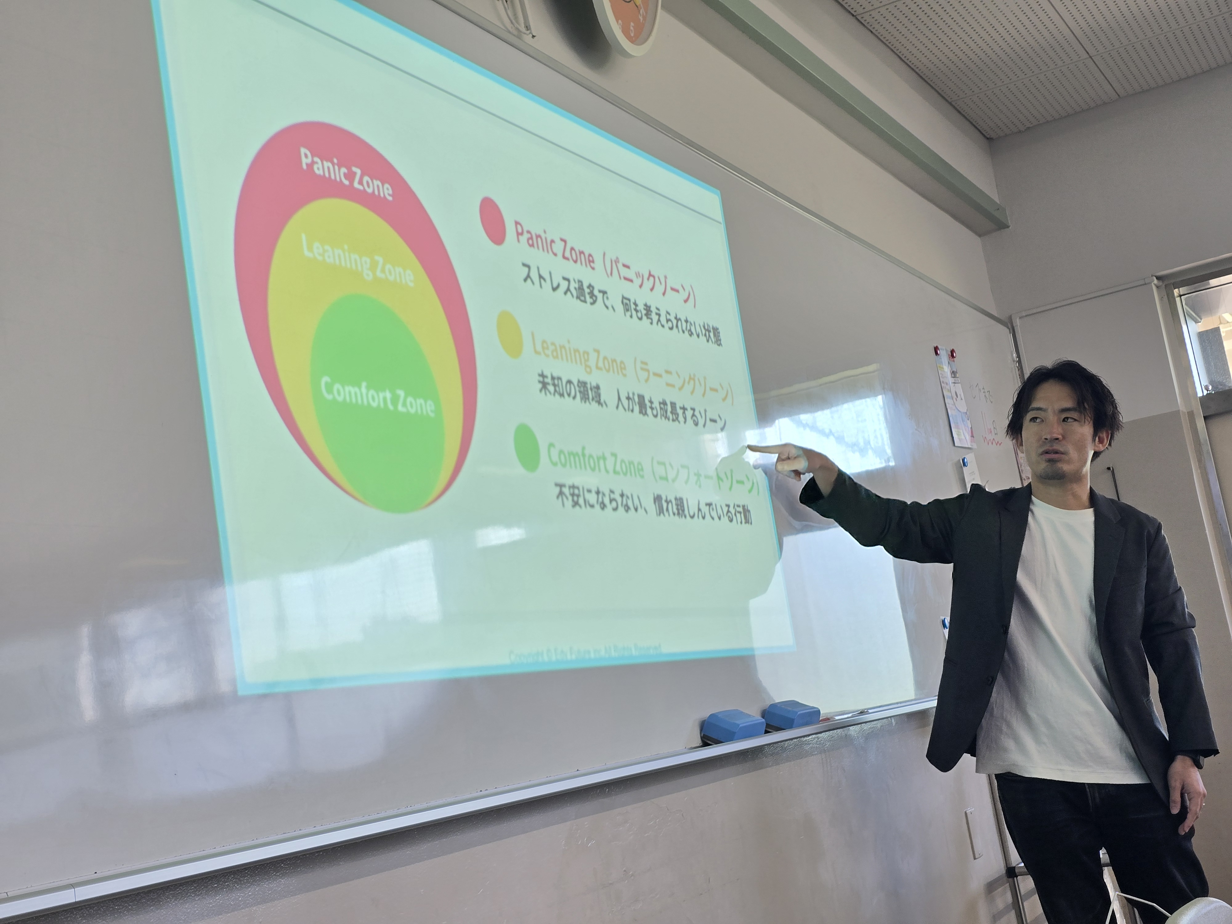 講演では、Comfort Zoneから一歩踏み出し、挑戦と学びが生まれるLearning Zoneへ向かう姿勢の重要性が語られ、生徒たちは海外研修に臨む心構えと意義を改めて再認識する良い機会となりました。
