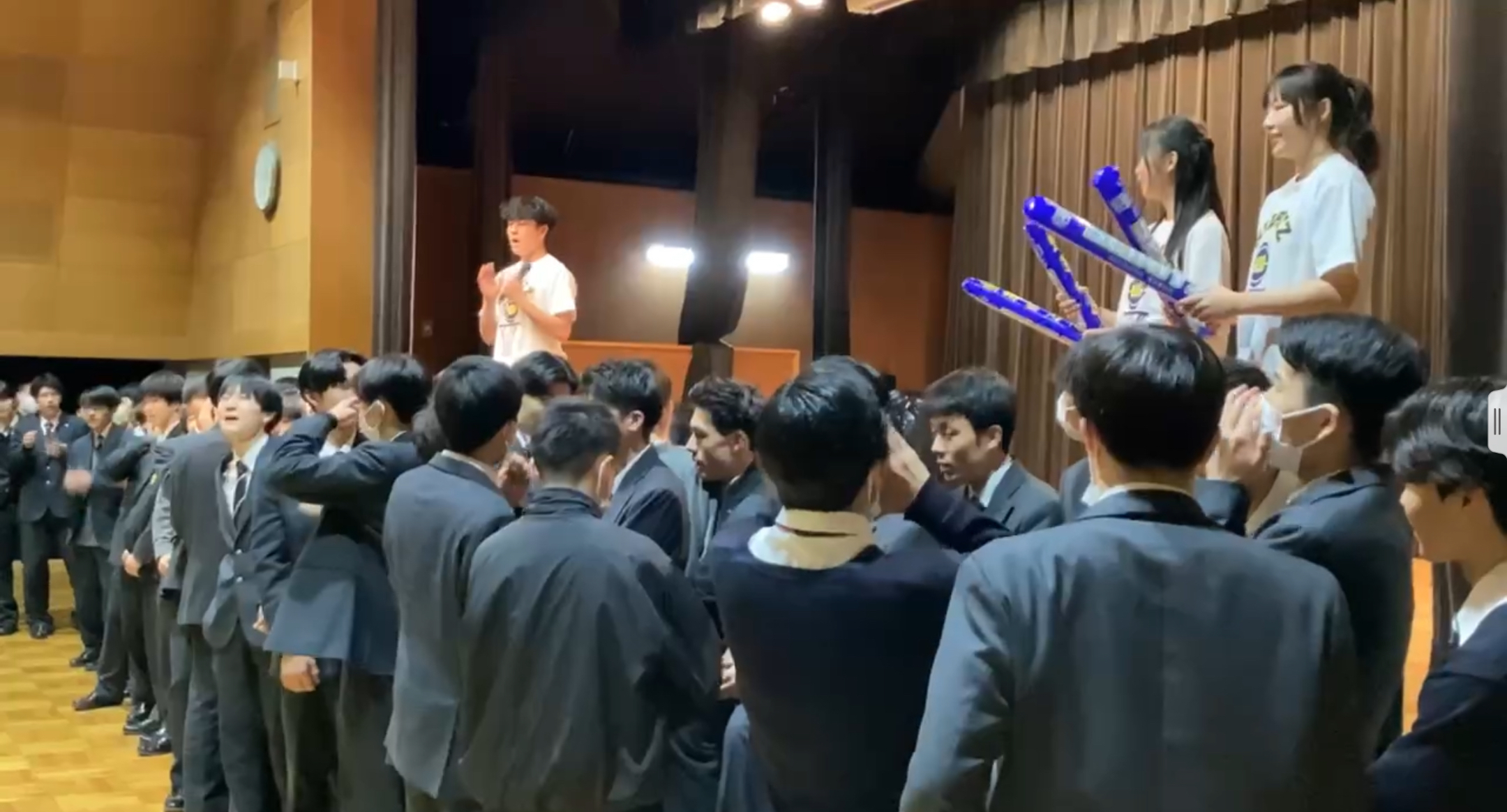 その後、応援チームと男子バスケットボール部を中心にみんなで応援練習し、声と手拍子を合わせました。