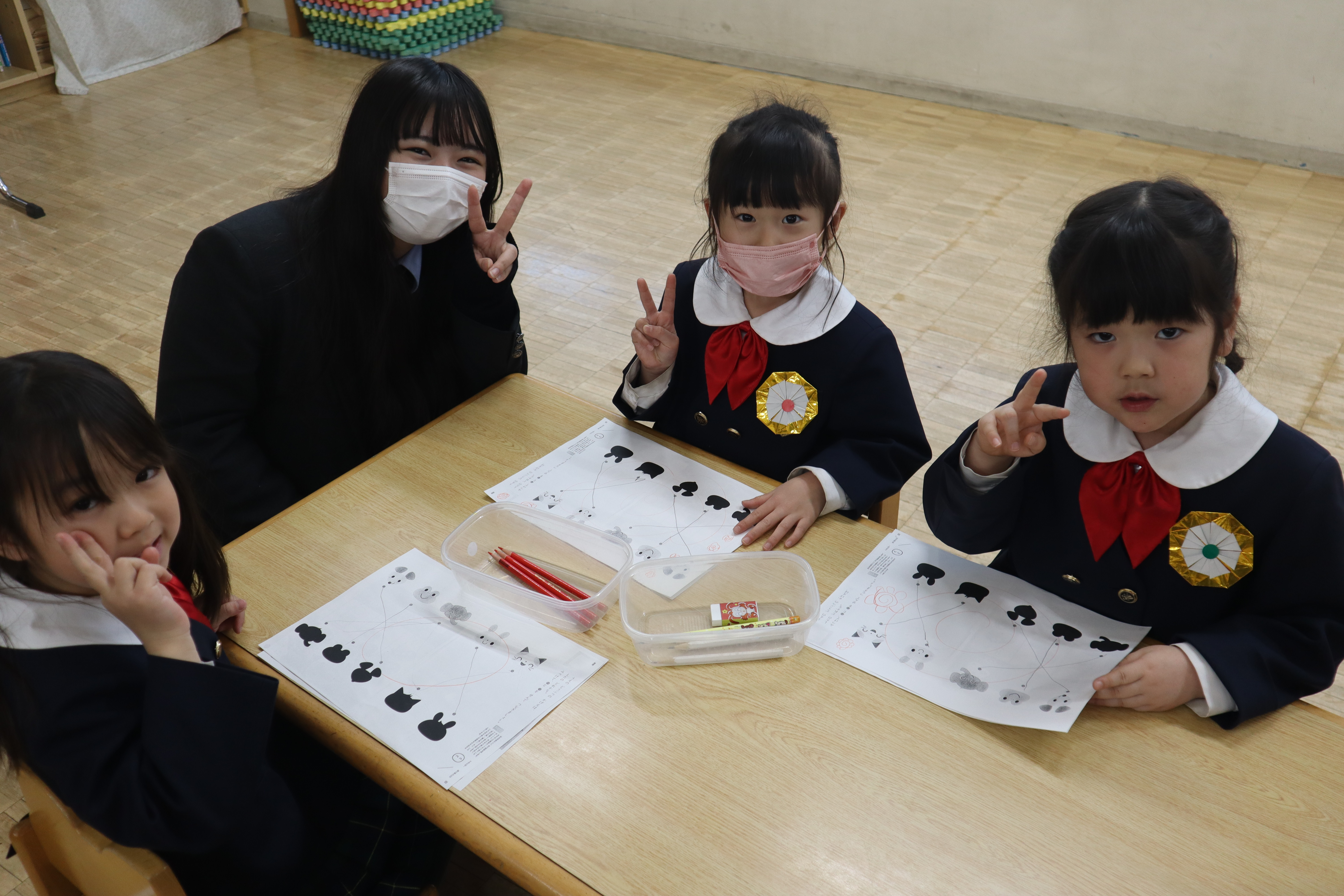 今まで通りマンツーマンに変わりはありませんが、先生役の本校の生徒は園児に教えるのではなく、園児たちの頑張る姿を応援して見守ります。