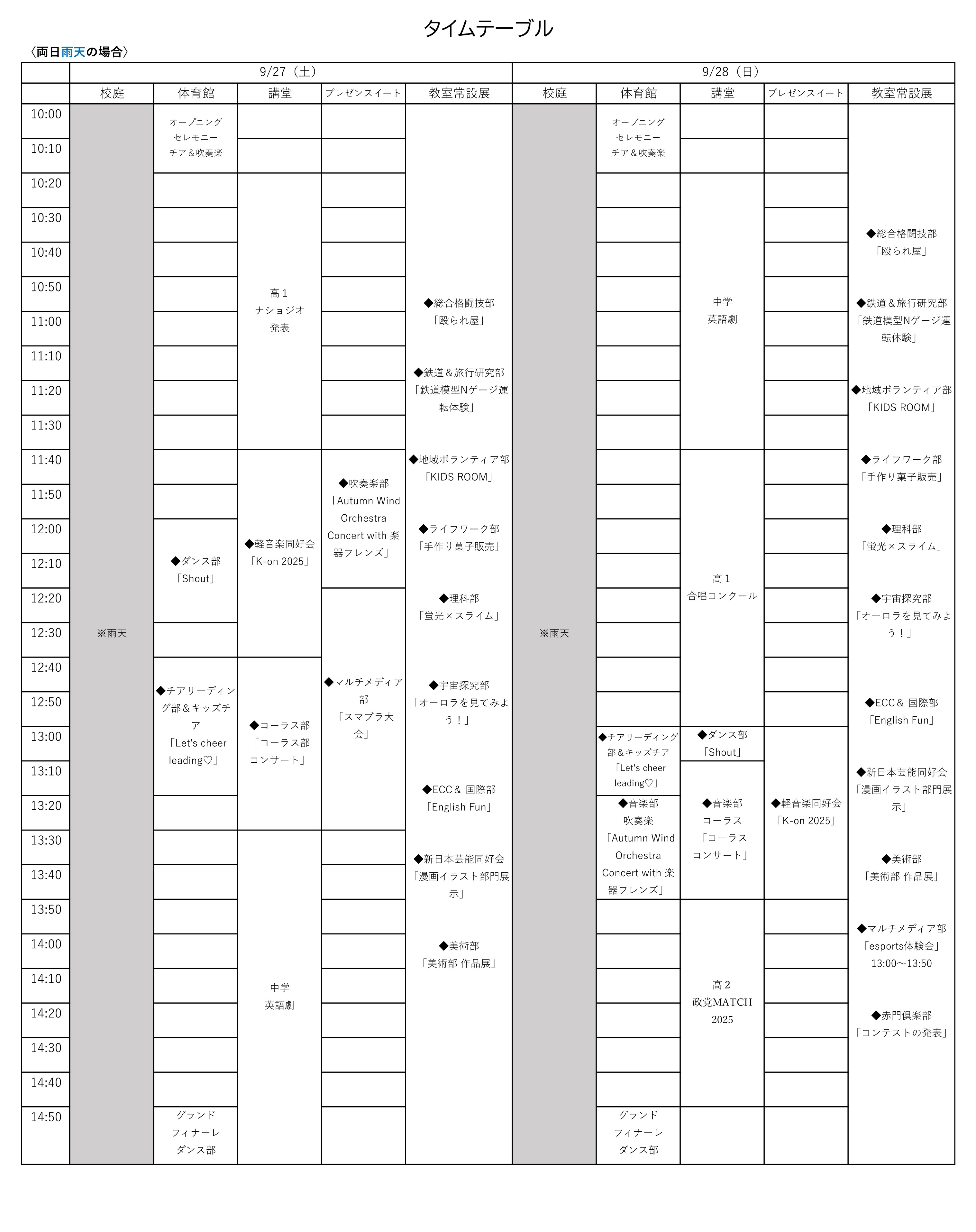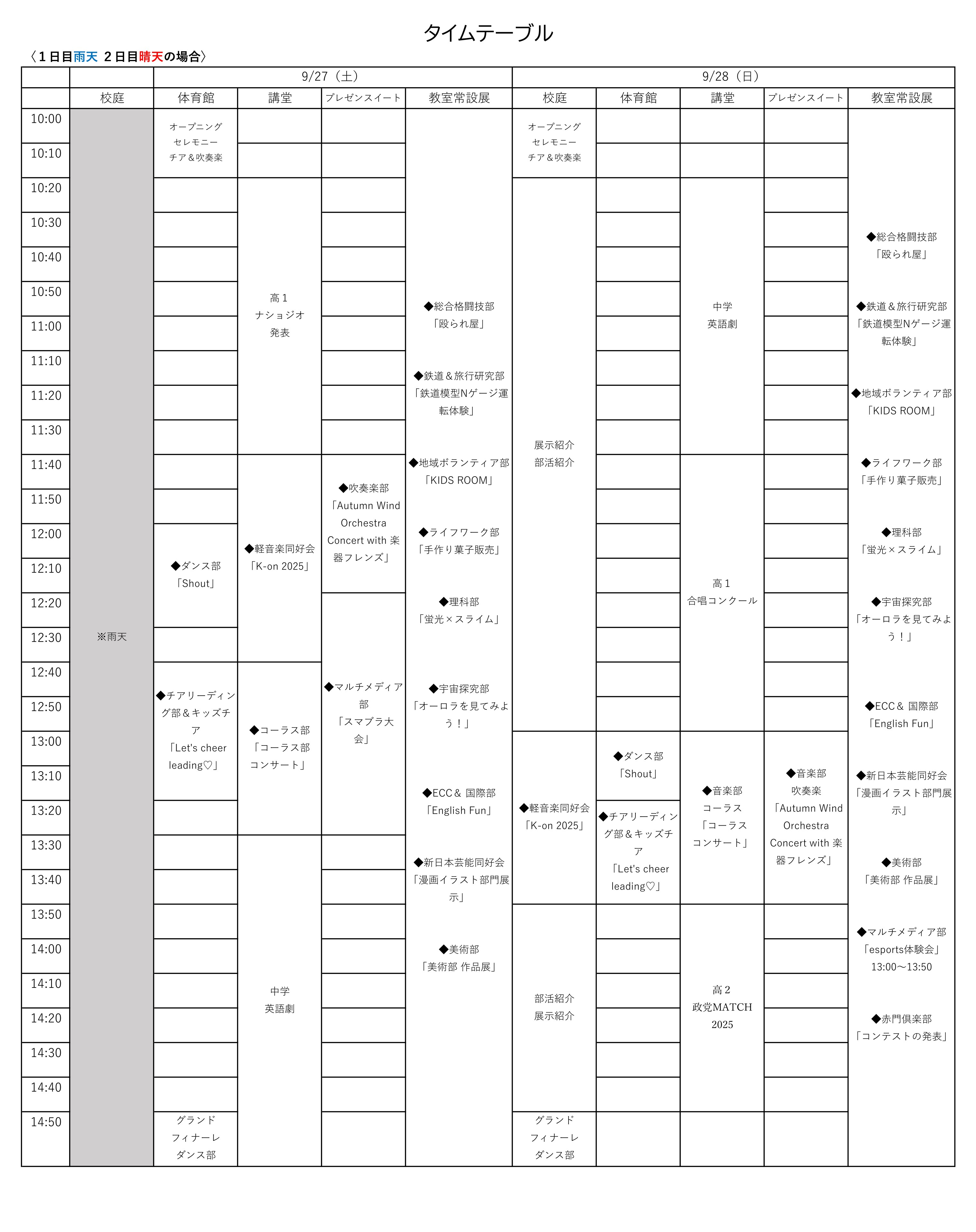 なお、1日目の天候によっては、2日目が晴れていても雨天用スケジュールでの実施となる場合があります。