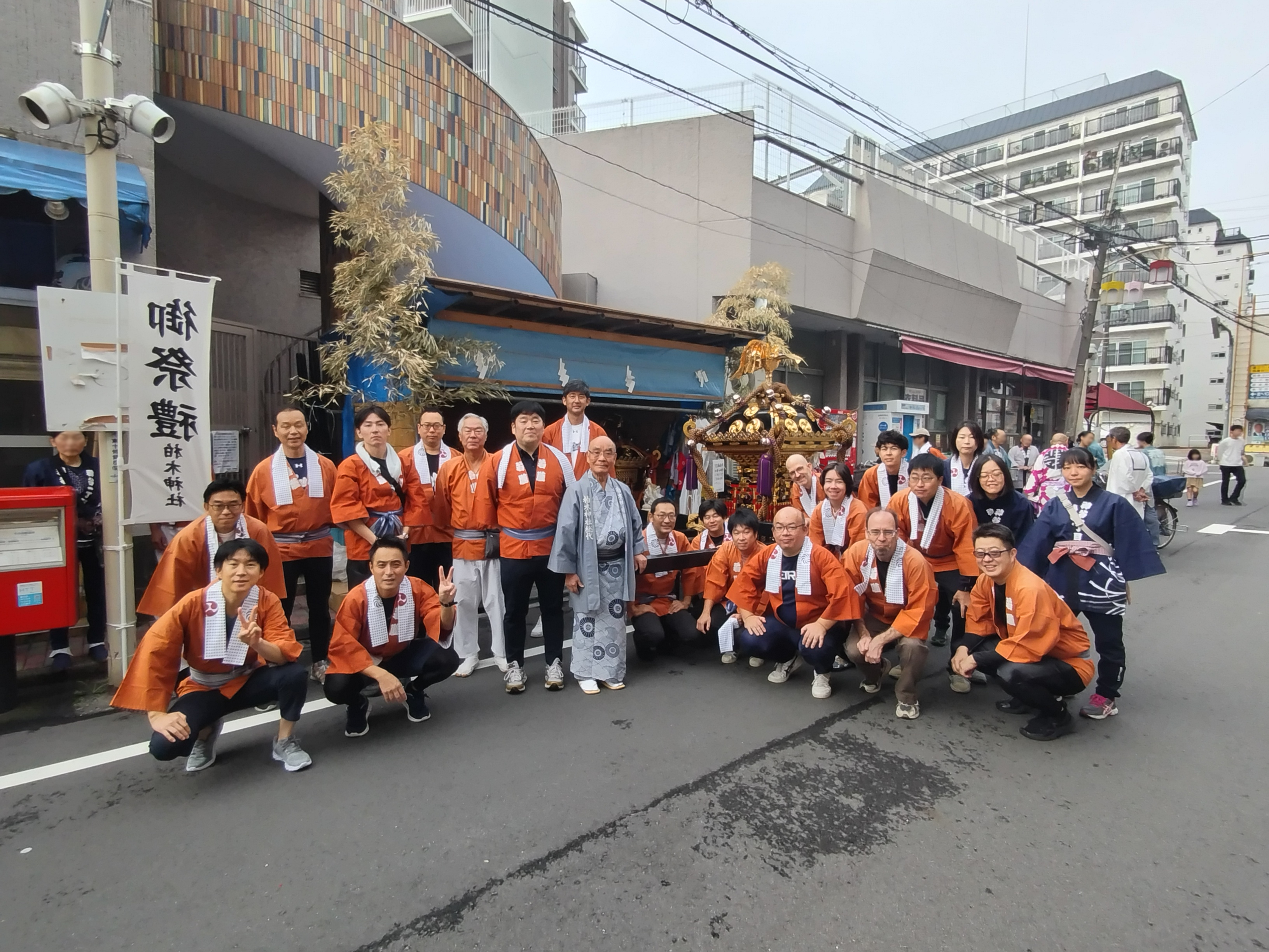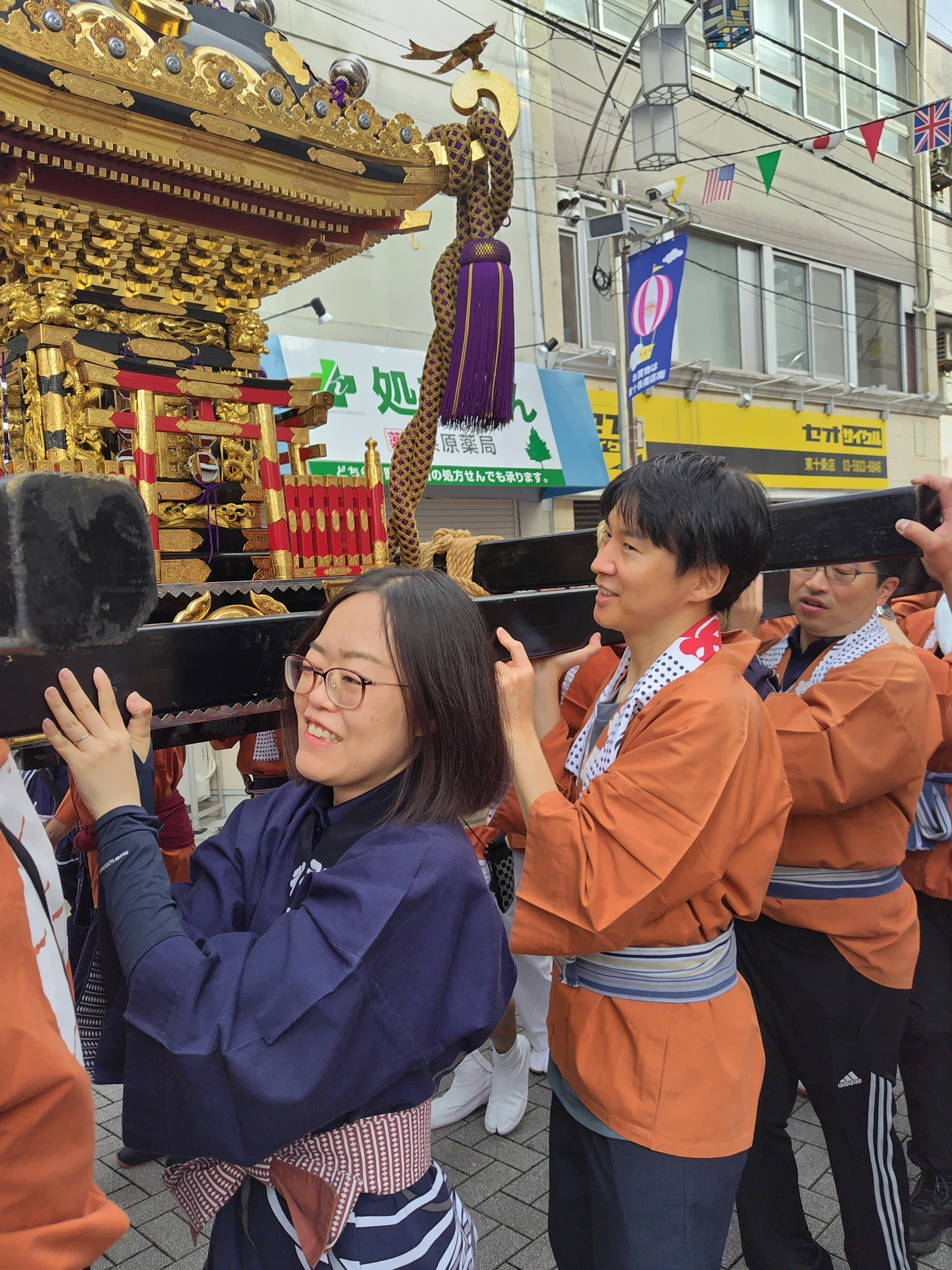 実際には、ほとんどの教員が御神輿を担いだことがないようです。留学生も半纏を着ながら日本の文化を肌で学んでいるようです。今回のルートは、神谷一丁目から始まり、柏木神社で宮入、宮出を経て、神谷一丁目まで戻ってきます。
