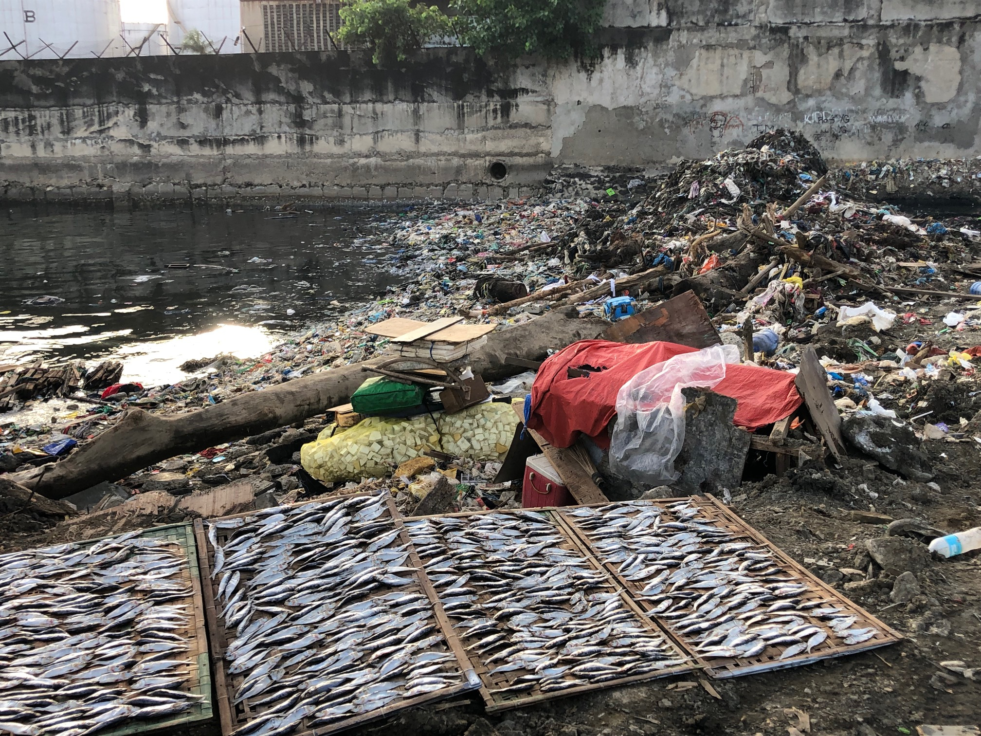 うそのような光景ですが、ごみと一緒に並んでいるのは魚の干物です。