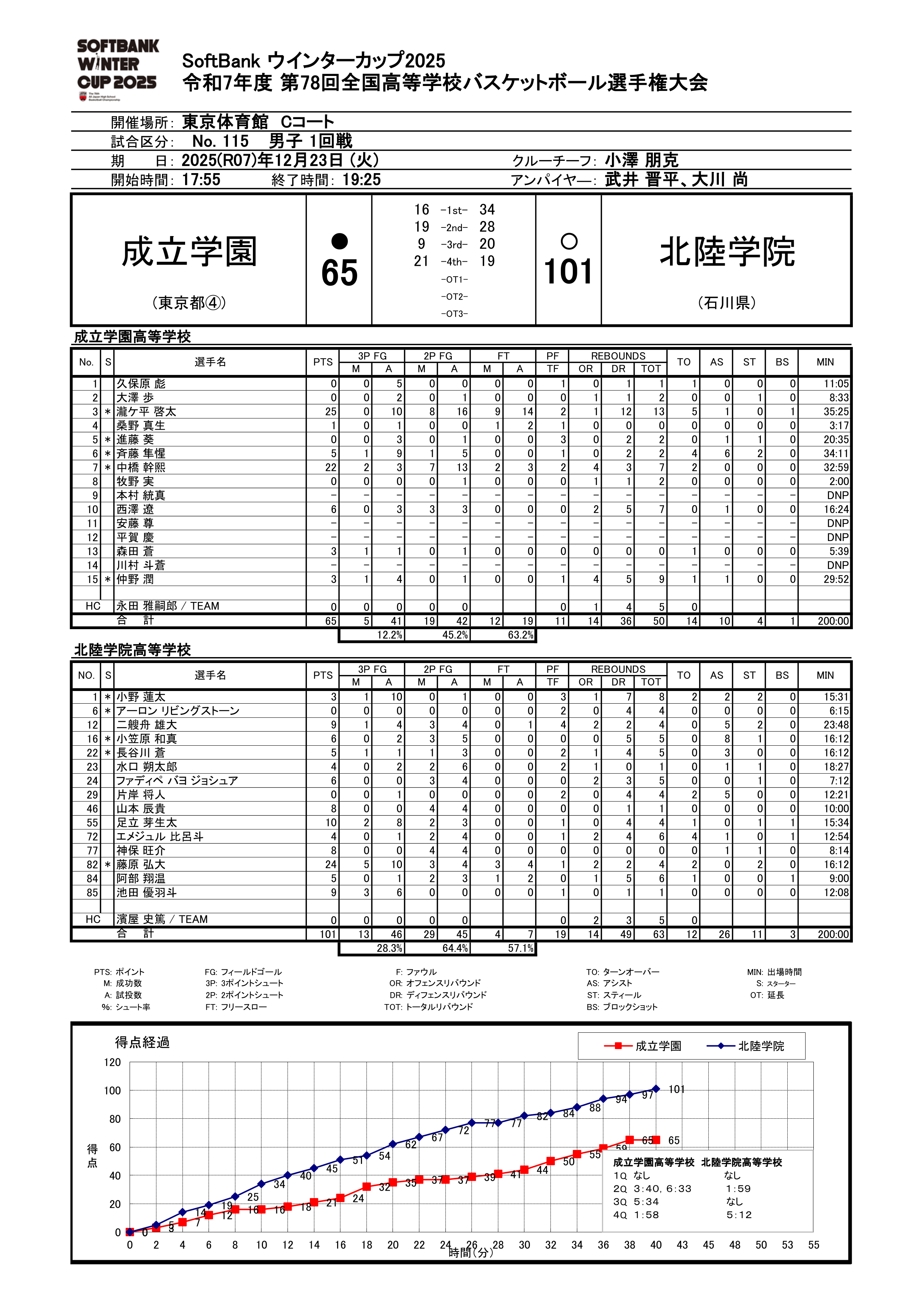 「SoftBankウィンターカップ2025」(2年ぶり2回目出場)を迎えた12月23日(火)、成立学園は強豪、北陸学院(石川県代表)と対戦いたしました。