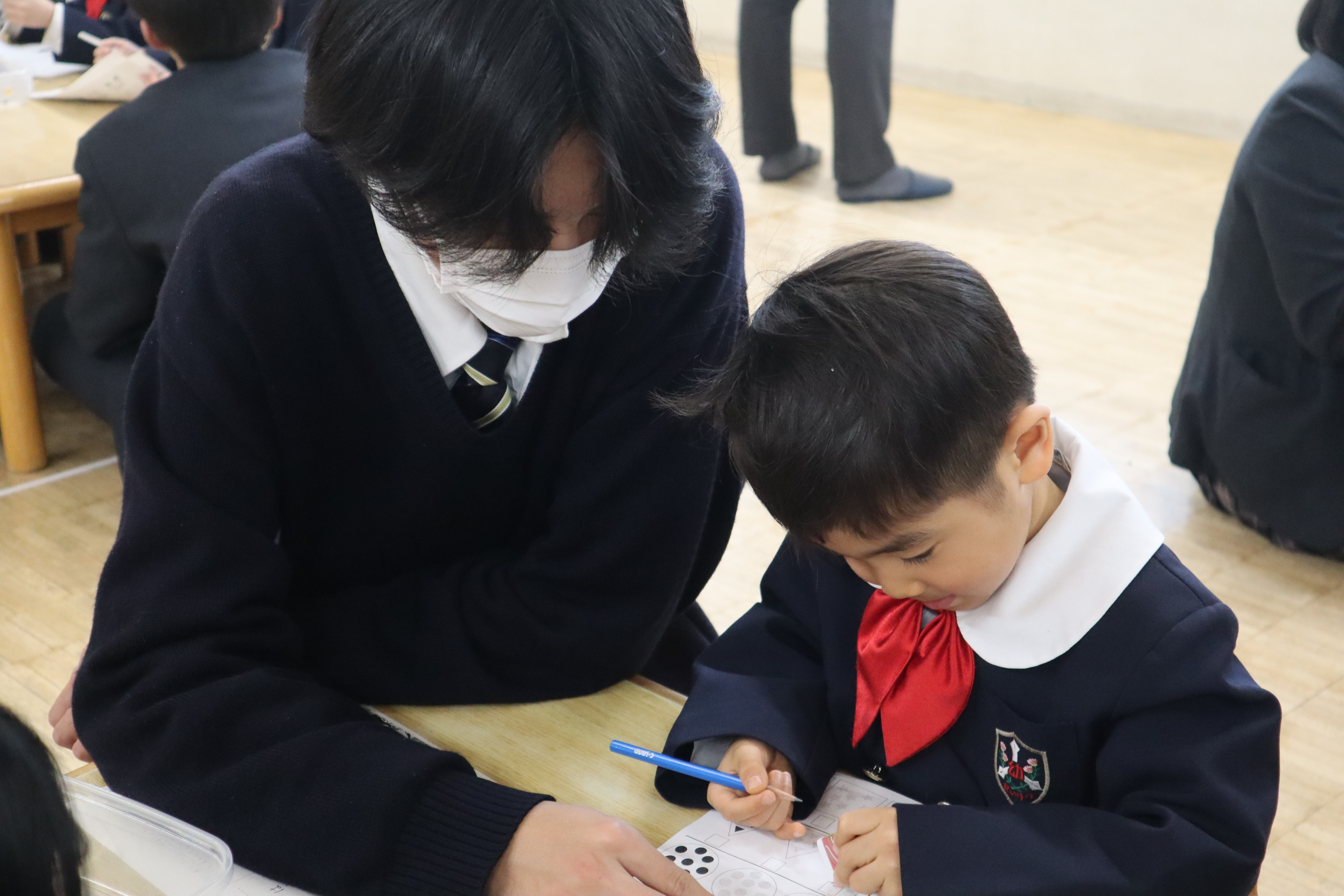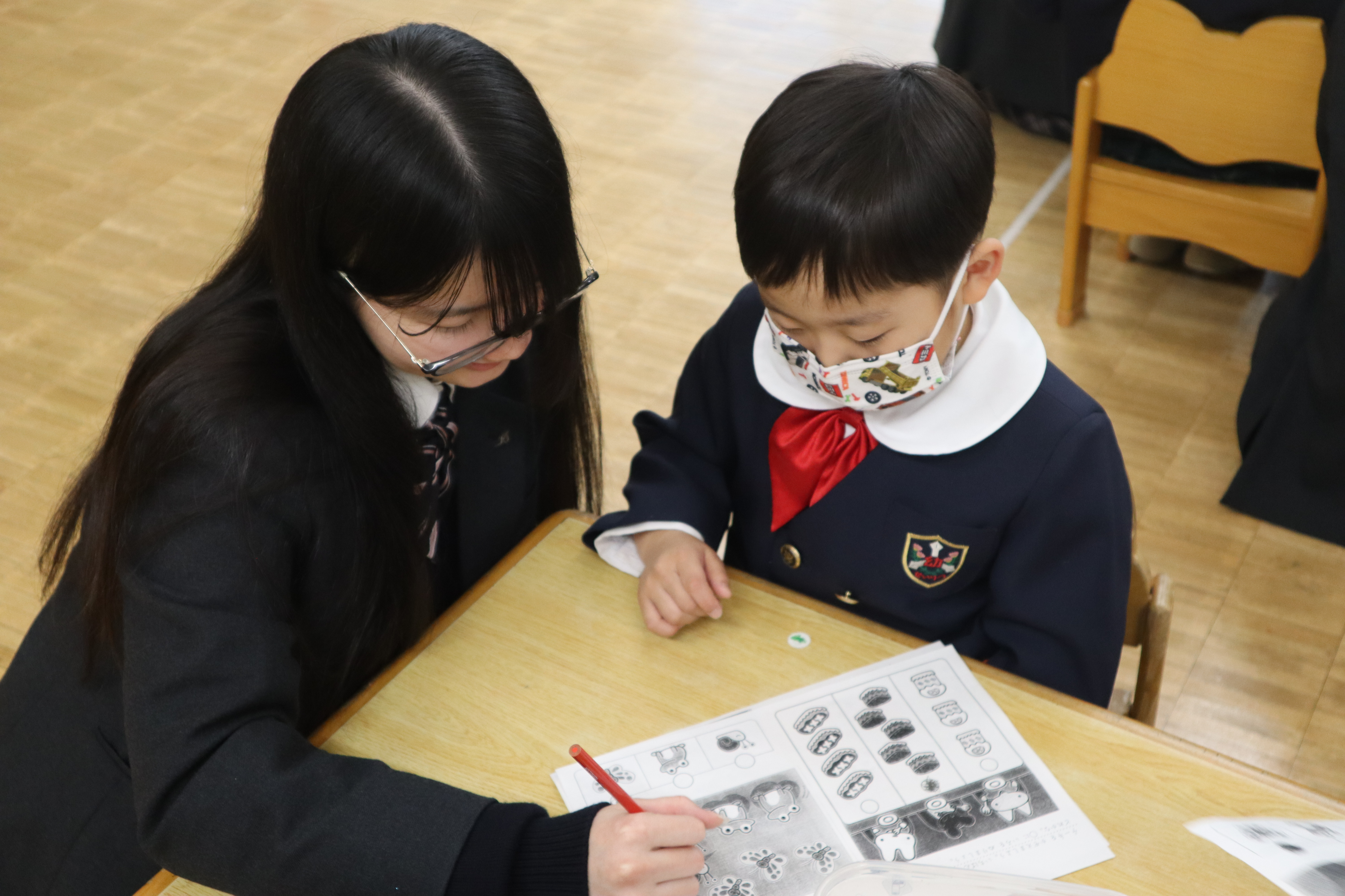 今まで通りマンツーマンに変わりはありませんが、先生役の本校の生徒は園児に教えるのではなく、園児たちの頑張る姿を応援して見守ります。
