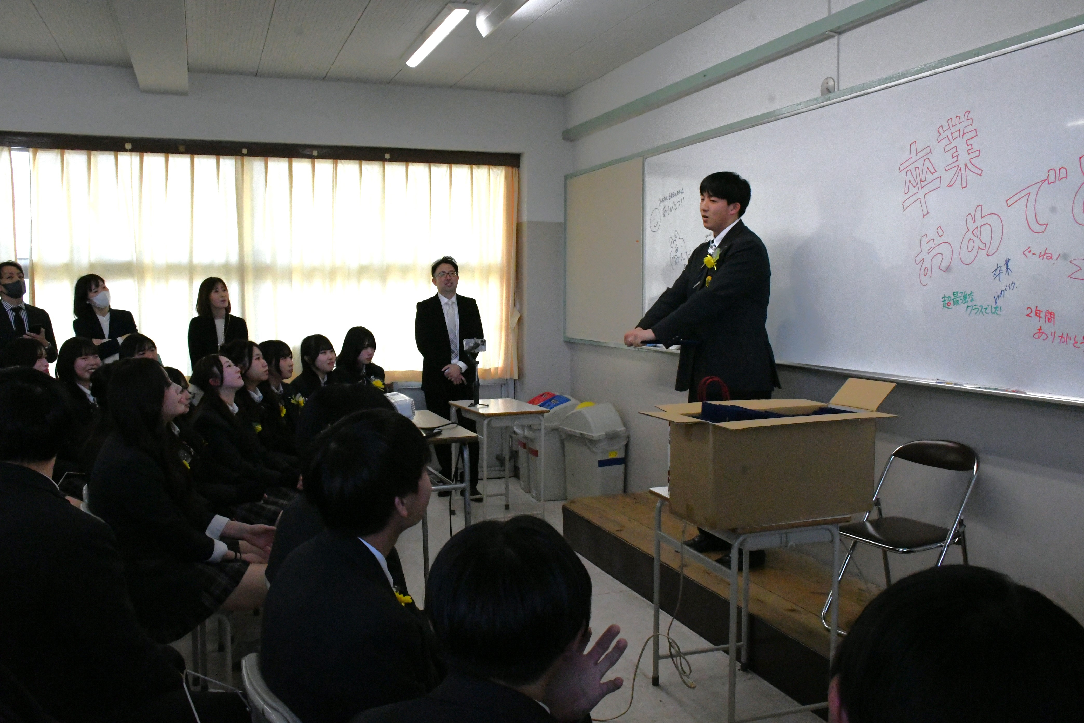 式後は、各クラス担任とともに最後のホームルームを行い、また後輩たちからのお祝いの中、本校を巣立っていきました。