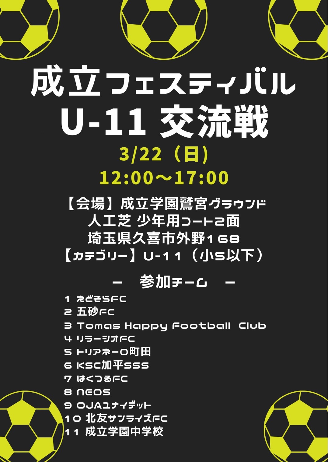 2026.03.18 サッカー(中学) 成立学園フェスティバルU-11交流戦 小学5年生を対象とした「成立学園フェスティバルU-11交流戦」を、3月下旬に成立学園鷲宮グラウンド人工芝において開催します。 ジュニア年代の試合経験を通してレベルアップを図り、本校の環境を知っていただくことが目的です。 一覧へ戻る