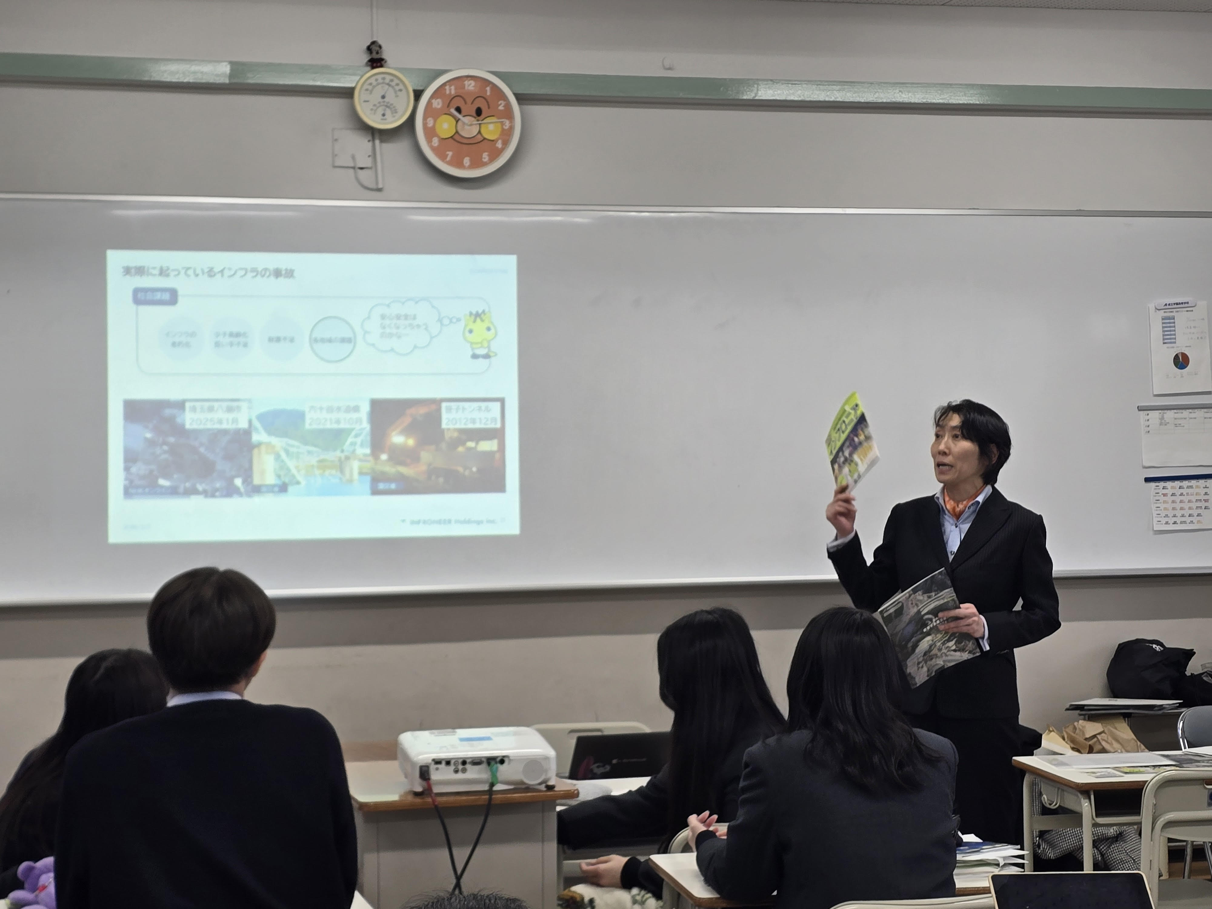 講義では、私たちの生活を支える通信インフラの使命とともに、企業が直面しているリアルな課題についても共有があり、生徒たちは真剣な表情で耳を傾けていました。