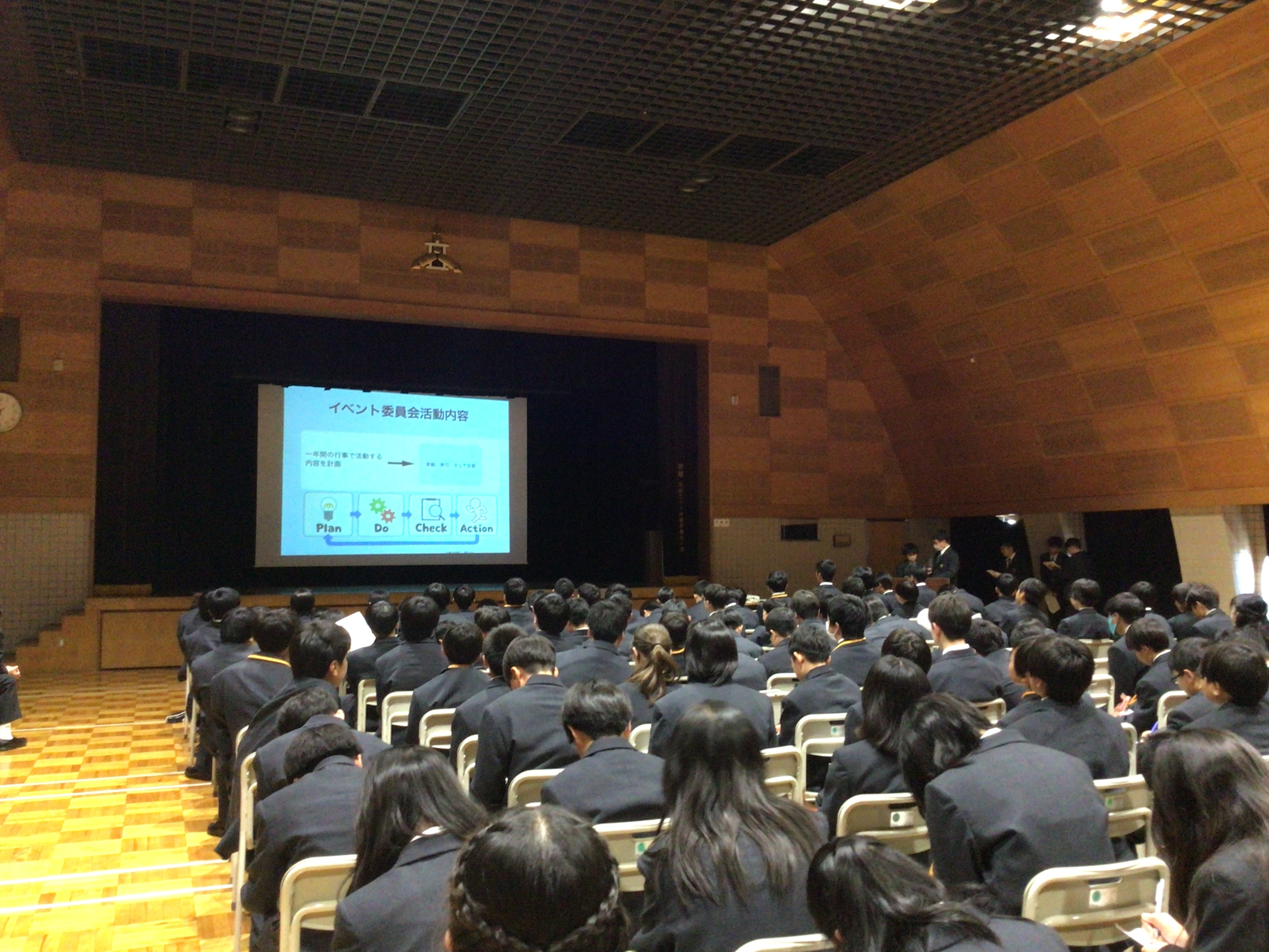 その後、会場を講堂に移し、2年生から新1年生に向けて学校行事やクラブ活動の紹介を行いました。